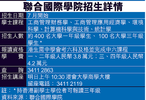 【本報訊】香港浸會大學與北京師範大學在珠海合辦的私立貴族大學——聯合國際學院,明日將舉辦招生講座,下月起正式招生。學院計劃首年招生五百人,香港及海外學生共約佔二百人,每年學費約港幣三萬六千至四萬元,今年九月開課。