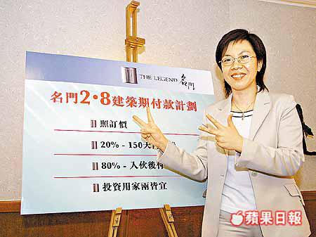 梁婉君表示,名門提供名為「2、8建築期付款計劃」。買家於150天內分段付樓價20%後,80%餘款明年底入伙後才繳付,投資者有18個月時間轉售圖利。計劃照定價;即供付款樓價有3%折扣。