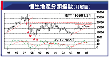 恒生地產分類指數上周五反彈,收報16901,升167點,宜守250日線16540之上,因04年8月至今,曾5次跌至該線均獲支持而反彈,因此,該線相當重要。03年至今,長期升軌支持力,日前在16350,不宜失守,但由於STC(Slow)利淡,使升軌可能不保。