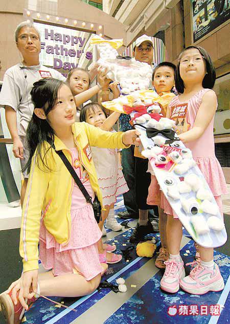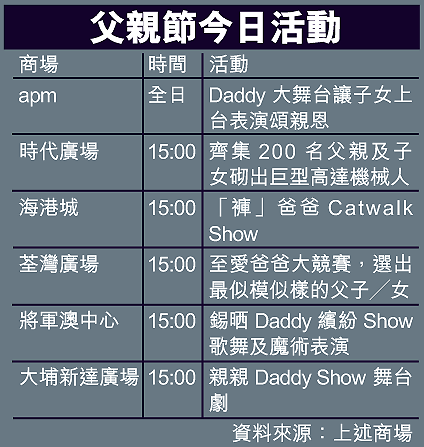 不少商場亦推出父親節活動催谷人流,時代廣場昨在露天廣場向父親大派八吋長的呔形曲奇餅,約一千塊曲奇餅半小時內派光。商場發言人稱,今日父親節會齊集二百位父親及子女,一同併砌一個十六呎高的高達機械人,預料商場人流急升一成高達十五萬人次。