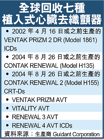 【本報訊】美國醫療儀器生產商GuidantCorporation全球回收七種植入式心臟去纖顫器,估計數量共五萬部。有關儀器出現短路及記憶故障,美國有兩名使用者死亡。本港衞生署及醫院管理局表示,暫時未知本港有多少病人受影響,呼籲病人若發現儀器出現怪聲或有觸電感覺,應即向醫生或到急症室求診。