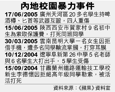 校園暴力一直困擾廣東省內的中小學。二○○三年,廣東省學生涉及校園暴力、集體毆鬥、自殺等非正常死亡人數為一百一十多人,二○○二年更多達八百四十多人。
