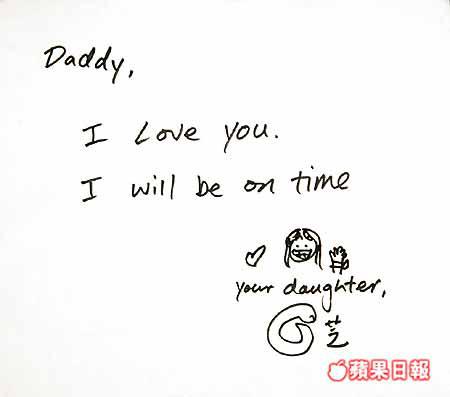 至於父女相處方式,趙式芝笑說:「平時盡量都會陪佢食下飯,得閒寫啲心意卡,有時都想同爹哋有個bighug,不過我哋係屬於心照嗰種。」對於被父親投訴遲到,趙式芝解釋說:「我唔係特登,可能自己性格想做太多嘢,不過只得一雙手、二十四小時,我會學習守時。」