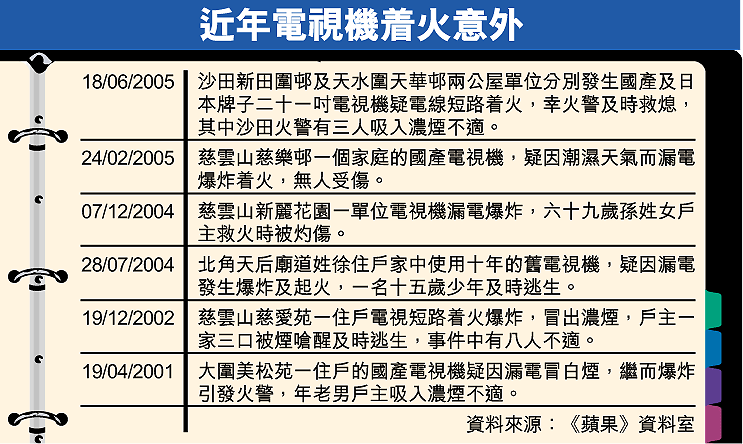 另一宗電視機火警現場為天水圍天華邨華佑樓六樓一單位,女戶主姓梁(三十八歲),昨下午約二時,女戶主外出購物,只有其一對分別十一及十二歲女兒在家,其間一對小姊妹開啟廳中一部二十一吋日本牌子電視機觀看節目時,電視機突然冒煙着火,小姊妹見狀立即逃出屋外及致電母親報案,保安員聞火警立即將兩小姊妹帶往安全地方。消防員到場迅速將火救熄,起火單位損毀並不嚴重。火警中消防疏散數十名住客,幸無人受傷。消防員調查後,相信火警因電視機短路引致。