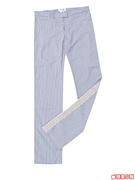 ■Paul&Joe粉藍色Pinstripe長褲,飾以米通花布邊。$2,160(LC)
