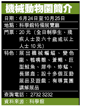 科學館助理館長吳國偉說,「機械動物園」(TheRobotZoo)本是兒童圖書,將動物繪成機械生物,講述其特性,美國科學家後來斥千多萬元將「機械動物園」帶到真實世界;新加坡科學館購入「動物園」後曾在當地、澳洲及台灣展出;本月二十四日至今年十月二十五日,機械動物將在本港科學館與港人見面。