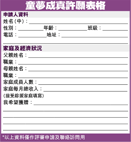 填妥嘅許願表格,請傳真或寄交:將軍澳工業邨西駿盈街八號蘋果日報慈善基金收,信封面註明「蘋果基金童夢成真行動」,待基金審核符合資格後,將盡力助孩子償願。