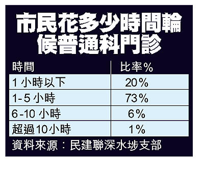 【本報訊】民建聯就深水埗居民輪候普通科門診輪籌時間進行調查,發現七成三受訪市民要花一至五小時輪籌,百分之六人更稱要用六至十小時輪籌,甚至通宵輪候才可確保能夠應診;有該區區議員批評區內門診服務不足,建議增加預約服務及中醫門診服務。
