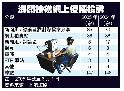 海關資料顯示,今年首五個月接獲一百四十七宗涉網上侵權投訴,其中BT下載個案佔最多,達八十五宗,超越去年全年的七十宗,其次是拍賣網站售賣盜版物品個案,達三十六宗。
