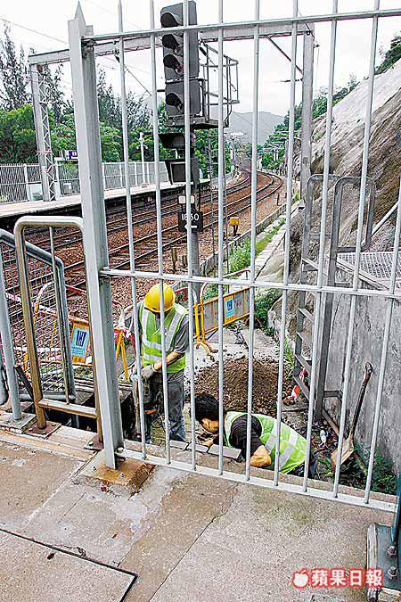 昨日中午,多名水務署工人到達大學火車站北行線月台前端斜坡勘探,為凌晨在火車路軌鋪設臨時食水管工程作準備,預計工程最快本周四完成,校園斷水長達四日。