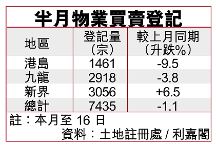 利嘉閣地產董事總經理何紹章指出,6月首16天土地註冊量共錄得7435宗樓宇買賣合約登記,較上月同期輕微下跌1.1%;總值252.39億元,跌16.3%,表現遠勝預期,顯示現時樓市基礎非常穩固。二手樓價持續飆升,部份投資者更不斷在東涌、深井、青山公路、上水、粉嶺、大埔等地區掃貨。他估計,6月全月樓宇買賣登記量料逾1.2萬宗。