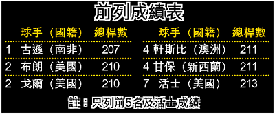 相反,原本與古遜並列首位進入第三天賽事的布朗和戈爾,卻未能承接氣勢,只能做出七十二桿成績,並被古遜拋離三桿。對於被對手搶走首位,布朗心服口服地說:「古遜可能是全部人最集中的一位,他沒有理會其他人成績,只打自己的球。」而「老虎仔」活士同樣打出七十二桿成績,與另外三位球手並列第七位,奪標機會渺茫。