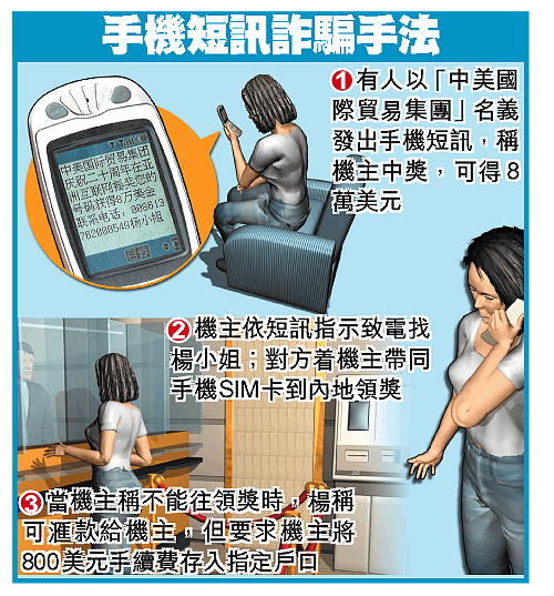 住在沙田的梁小姐日前收到一個手機短訊,內容為「中美國際貿易集團慶祝二十周年,在亞洲互聯網抽獎,您的號碼獲得八萬美元」,並留有一個內地的電話號碼,着機主致電聯絡一位楊小姐。梁小姐依指示致電找楊小姐,對方堅持要她到深圳領取獎金。梁懷疑事件有欺騙成份,故上網找資料,得悉新加坡警方已將有關手機短訊列作騙案。