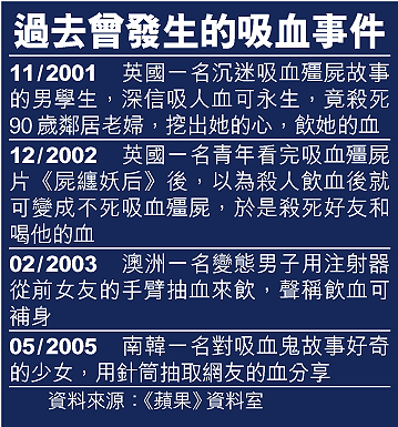飲人血事件近年不時發生,上月南韓一名對吸血鬼故事充滿好奇的少女,利用針筒從一名在網上認識的少女手臂抽取血液飲用而被捕。