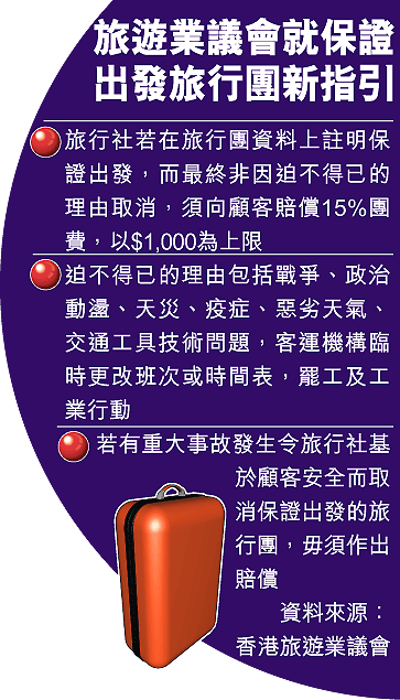 代表本港主要旅行社的香港旅遊業議會已就「保證出發」旅行團發出指引,規定旅行社若在廣告、行程表及收據等資料上註明「保證出發」,而最終並非因迫不得已的理由取消旅行團,須向顧客支付百分之十五的團費作賠償,以一千元為上限;而現行取消旅行團最少七天前通知的規定亦適用於保證出發旅行團,即旅行社若未能在七天前通知顧客,另須再賠償百分之十五的團費,以一千元為上限。