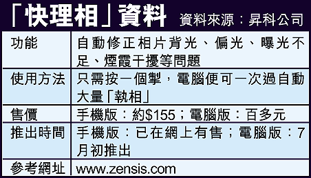 【本報訊】有時拍攝大量數碼相片時,想起要「執相」或會令人感到煩惱,中文大學兩名訊息工程學系畢業生研發了一套圖像處理軟件,只需按一個掣,電腦即可自動大量糾正有曝光不足或背光等問題的相片,連「師奶都識用」,手機版本已獲得大型手機公司採用。 記者:倪清江
