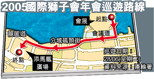名為「2005國際獅子會年會大巡遊」將於下周二舉行,由黃昏六時巡遊至晚上十時,估計有近二萬人參與,主要是民間風俗為主題的表演,沿途可容納數以十萬計市民及旅客圍觀。國際獅子會香港前總監文錦歡表示,一九九二年本港也舉行過年會及大巡遊,今年參加隊伍有一百四十五隊,路線與近年港島區賀年花車巡遊大致相同,由灣仔會展至金鐘添馬艦廣場。
