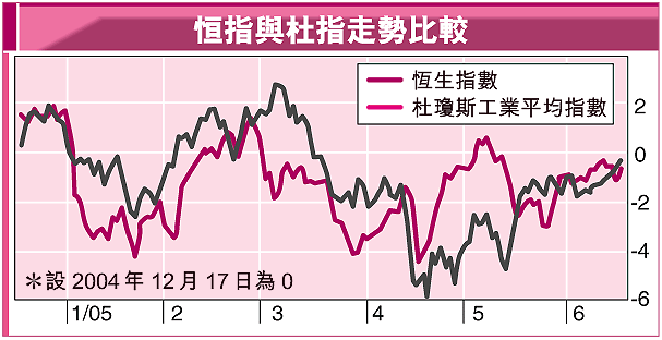 附圖是美國杜瓊斯指數與恒指在過去6個月的走勢比較,圖中可見,近期港股與美股的走勢頗為同步,兩者的相互關係頗強,假若稍後美股下挫,亦可能對港股構成一定壓力,因此,港股經五窮、六絕後,7月翻身的機會可能較低。