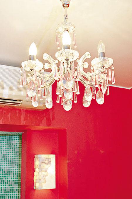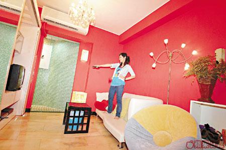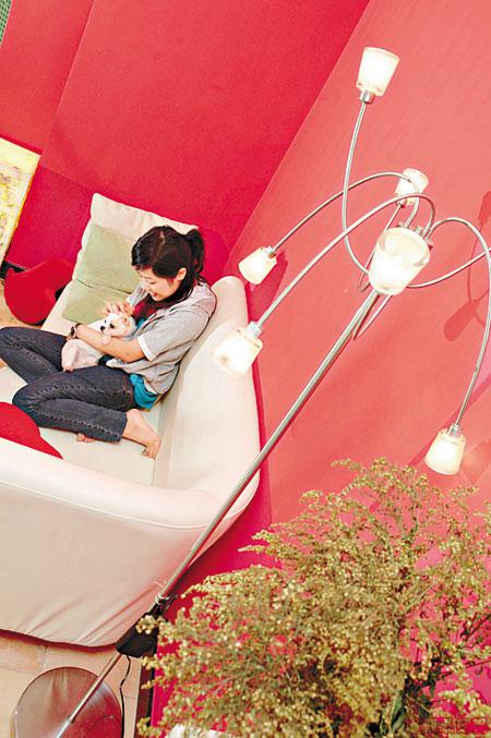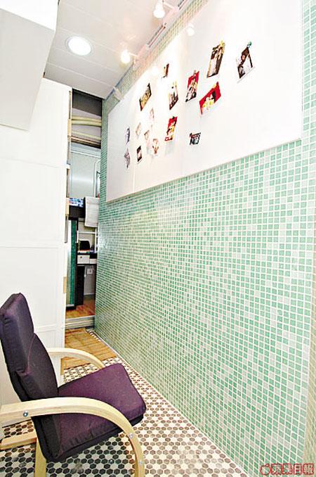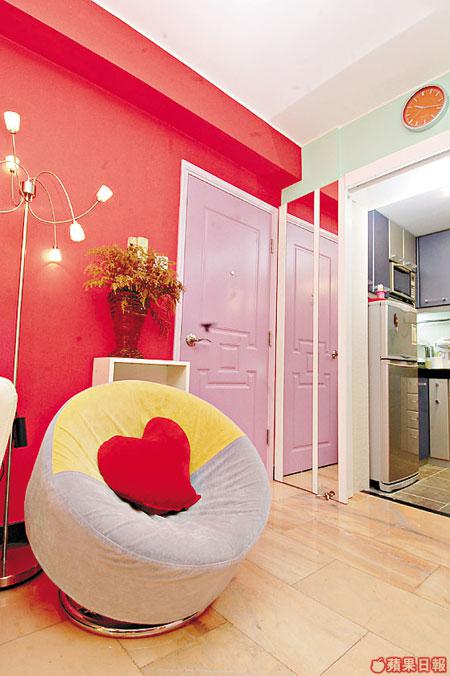 雖然面積細小,但因大鏡有擴闊空間的效果,即使牆身用上七彩顏色也不會產生壓迫感。梳化後的牆身連同通往廚房那面牆漆上一片鮮紅,配上粉紫色的大門,十分搶眼,另兩面牆分別髹上深奶黃色及深粉綠色,四種顏色組合起來出奇的合拍。