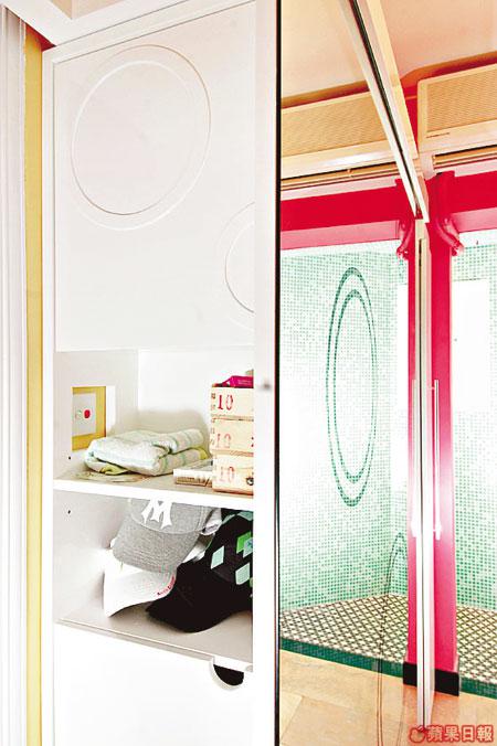 當中玄機是客廳的四塊鏡子,鏡子其實是混淆視覺的趟門。四塊鏡子趟門呈90度角,推推拉拉就可以遮蓋睡房門、電視櫃和電腦室等。加上鏡上大大小小的圓圈圖案,營造眼花的感覺,好有迷宮Feel。當兩塊鏡子趟門趟在一起成90度直角時,因反射的錯覺,令空間感大增,客廳看起來就比實際面積大很多。