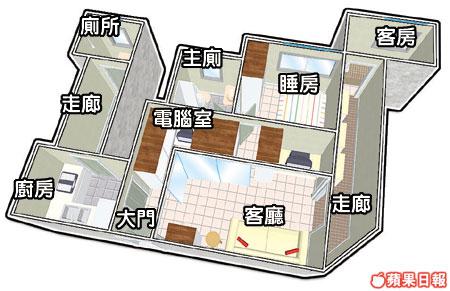客廳左右兩邊分別有兩條走廊,要去洗手間,先要走入廚房,再通過擺放雜物的小走廊才能到達。另一條走廊由客廳伸延至客房,增加室內環境的複雜性,造就一個家居迷宮。