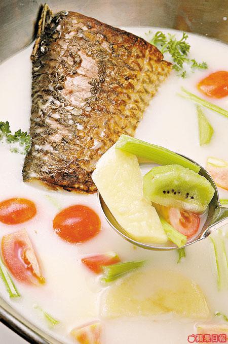 個半奇異果切粒加番茄、薯仔,草鯇取魚腩部份,先輕輕紅燒再放湯熬,免魚肉散開襟熬得多。