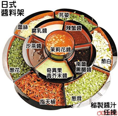 新店新裝修,地方潔淨絕非一般地踎火鍋店可比,全店得25張枱,枱與枱之間很闊落,Martin解釋:「打邊爐要大班人企起身烚吓烚吓先過癮,逼逼狹狹就唔好喇。」除卡座方枱外,還訂做的橢圓形枱,每張盛惠$9,000,兩頭闊中間扁,方便人坐中間鍋爐伸手可及,兩邊也可騰出更多空間擺放大小碟配餸。見微知著,提供的木筷子從老子號「萬記」特別訂做,有10吋長:「筷子長啲,夾嘢食都無咁易辣親手喇!」醬汁方面,店子提供3層高日式醬料架,上有茉莉花醬、腐乳醬、辣蟹醬、沙茶醬、南薑黑醋醬和奇異果青芥末醬6種醬料任擇,另加指天椒、芫荽、薑絲、葱茸、葱花與葱白,任客人自由組合大混醬,店員還會因應客人所選湯底與配餸,推介不同醬料作配合。