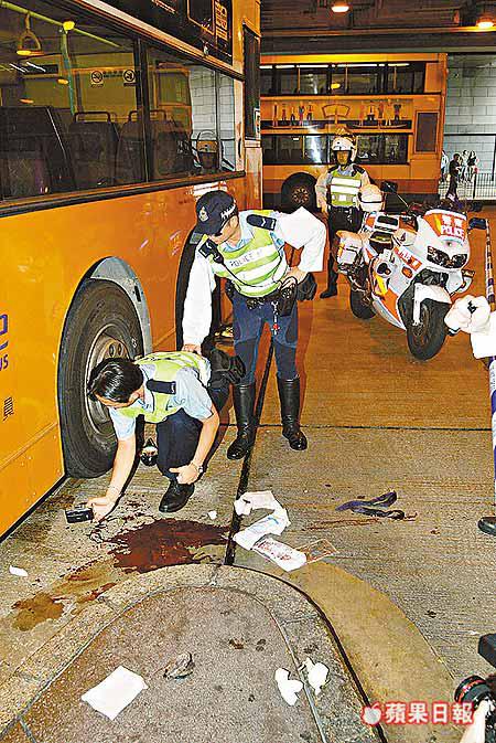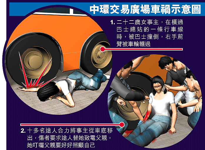 昨下午四時四十分,一輛行走香港仔海怡半島至中環的新巴M590線雙層巴士,在中環交易廣場地下的巴士總站埋站。其間,姓陳女子在站頭前橫過行車線,被正在轉彎的巴士撞倒,身體被捲入車底,右手臂被車輪輾過。