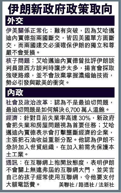 伊朗第二輪總統投票的結果出人意表,強硬保守派德黑蘭市長艾哈邁迪內賈德爆冷勝出,以壓倒性票數擊敗重量級政治人物拉夫桑賈尼,令保守派繼去年重奪國會控制權後再下一城,連屬改革派最後陣地的行政機關也搶去。保守派全面掌控政府,令人擔心改革和跟西方關係正常化等政策要急煞車,伊朗會朝另一個塔利班原教旨主義政權邁進。