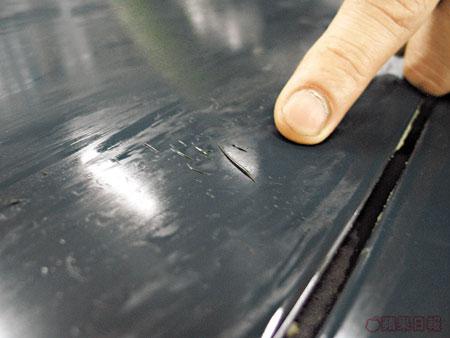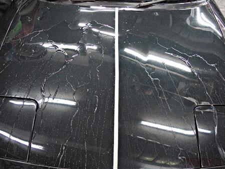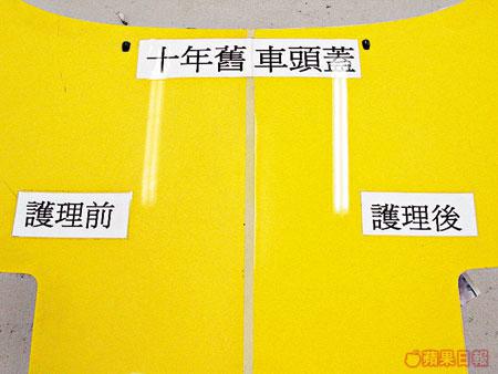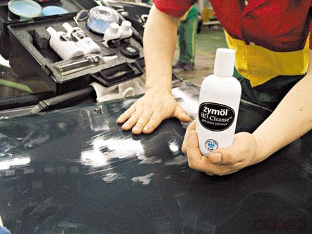 極品車蠟的施工過程亦十分特別,專業技師會先以去迹奶塗在漆面,再以人手直接把表面的污垢捽出,負責人表示這樣可對漆面的傷害減至最低。只見一條條的「老泥」捽出後,漆面已亮麗不少,然後再以專用軟綿把極品蠟均勻塗上及令漆面吸收,工序便完成。這次我不以火來測試極品蠟,改以倒水來試試它的去水能力。先為一邊的頭冚施以極品蠟,然後由未用上極品蠟的一邊頭冚開始倒水至已施工一邊,發覺未用上極品蠟的一邊明顯對水有張力,就算先倒水也不及用上極品蠟的一邊快速把水跣走,足證極品蠟的去水性極強。