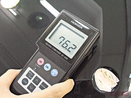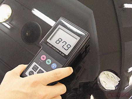 進入第二個漆面反光度測試,由客戶提供、未經護理的平治E-Class進行。先在漆面上以專用的反光測計量度,然後由技師在量度位置簡單塗上層玻璃質及加以打磨,再在同一位置量度反光度,發覺度數已即時上升。據負責人表現,如完成整個詳盡的護理過程,度數超過100是等閒事。
