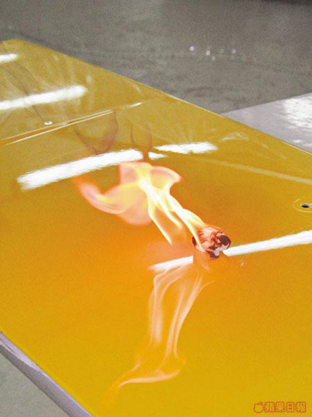 把一個尚未擠熄的煙蒂直接放在漆面上,待煙蒂燒至熄滅,再以濕布輕輕抹去,發覺漆面全無變色效果。這亦難怪,因為玻璃質可抵抗高達攝氏350度的高溫,煙蒂對它來說有如隔靴搔癢,惟有用個更大火的火球來試試它,但結果仍是一樣,不留任何燒過的痕迹。