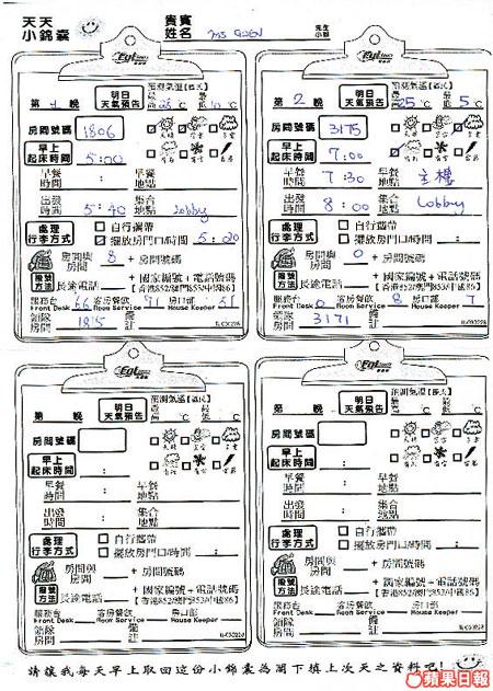 朋友說,東瀛遊的領隊不少聲線甜美,還禮貌周周,上落車都相陪左右!最近,我參加了東瀛遊的九寨溝旅行團,發現朋友所言非虛,不單止有笑容可掬的Sandy帶團,而且每個晚上都會派發一張「天天小錦囊」,內容包括明日天氣預告、起床、吃早餐和行李收集時間,還備有領隊房間號碼及酒店服務台電話!一張小小的紙張,絕對有助好像我這類型的大頭蝦不會以忘記起床時間為由,遲到出場。不過,用小錦囊提提你雖好,但好像有點浪費紙張,不如考慮吓轉用可擦拭的小膠板,循環再用,可以較環保。