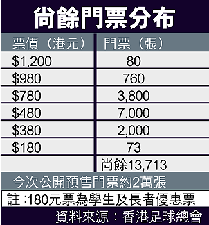 足總昨晚宣布,千二元及一百八十元之特惠票尚餘極小量(見附表),尚餘的門票今晨九時至下午六時繼續在香港大球場售票處發售。
