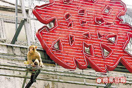 昨中午十二時許,另有一隻猴子趁難得一刻陽光普照,在油麻地窩打老道四十號寶翠大樓五樓露台享受日光浴,更大膽當「採花賊」偷摘住客的盆栽花朵果腹,悶極便爬上廣告招牌玩樂,警員到場亦無計可施。頑猴嬉戲約半小時後逃去無蹤。