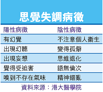 港大醫學院精神醫學系副教授陳友凱說,思覺失調是精神病早期警告訊號,就如發燒是顯示身體或出現毛病的警告訊號般。患者會出現幻覺、妄想、感到受迫害,及看到不存在的事物等陽性病徵;同時會出現不注意衞生、孤僻及語無倫次等陰性病徵。