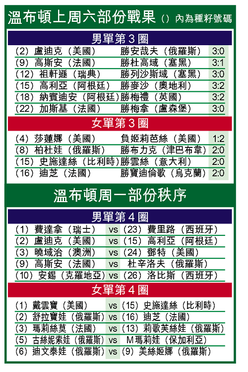 【綜合英國外電】兩屆冠軍的美國莎蓮娜,上周六成為今年溫布頓開賽以來,女單最大冷門賽果的犧牲品;她在第三圈以三比六、六比七輸給年已三十歲、寂寂無聞的同胞姬莉芭絲。至於英國新希望梅禮亦在同階段止步。