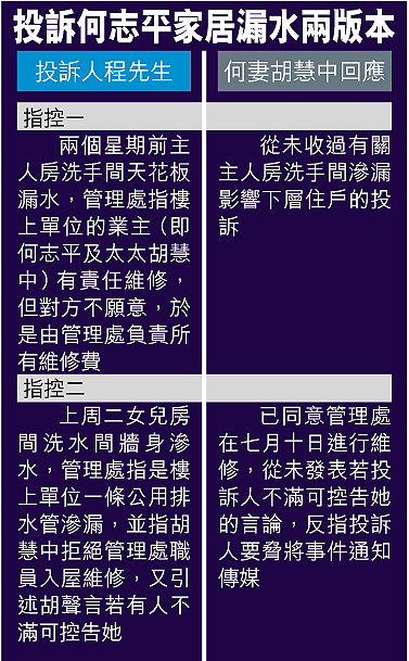 何志平昨日則透過新聞秘書回覆本報,指自己在六月中旬曾放假一個多星期,上周末則到了上海公幹,所以近期較少留在家中。他知悉家裏的水管滲漏,承諾會盡快相約對方感到方便的時間,安排工程人員檢查及維修。他又對事件造成下層業主不便深感歉意。