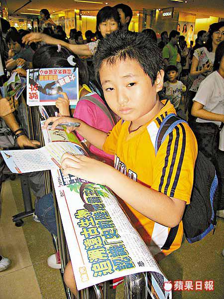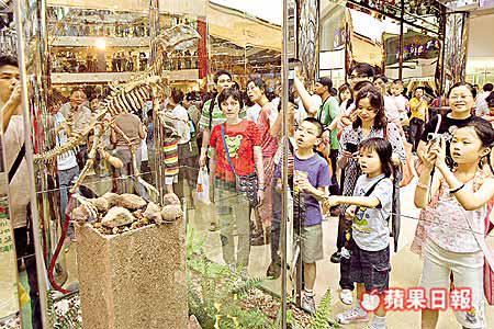 【本報訊】八頭生活在還未有人類的遠古年代恐龍,死後變成化石,經歷億萬年,現身在二十一世紀的香港鬧市商場內,在本港掀起一陣恐龍熱,令太古城商場出現十萬人迫爆的場面。前來參觀恐龍的市民不惜在烈日當空下排隊苦候四十五分鐘,只是為求一睹恐龍化石骨架的真貌,然後再輪候四十五分鐘,摸摸恐龍化石。 記者:陳沛敏