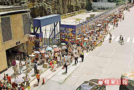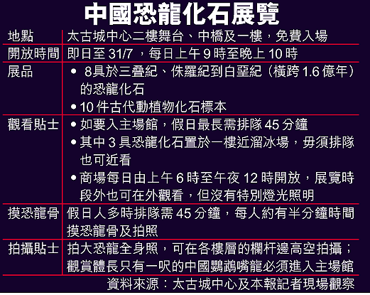 港島太古城中心舉行的中國恐龍化石展覽,昨日的人流比前日更厲害。在太古城地鐵站已見人潮,場面壯觀,有關方面要實施人流管理措施。直至晚上十時,輪候參觀恐龍化石的人龍仍未散去。有商場職員估計,前日有七萬人次前來參觀,昨日更是逾十萬人;但展覽的公關人員稱,暫未有正式的人流統計。