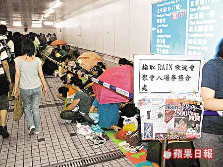 繼《大長今》李英愛等一眾韓星來港掀起熱潮後,劇集《浪漫滿屋》男主角Rain亦會於下周日抵港。環球唱片公司更在下周一安排了一個歌迷聚會,讓fans近距離接觸偶像,門票於今日開始換領,但前天起至昨午已有近二百名歌迷在尖沙嘴一隧道內輪候,但昨日不斷發生插隊情況,更有人報警求助,場面混亂。