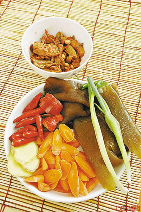 已醃捺菜大半碗、青椒半隻(切小片)、紅辣椒1隻、指天椒4隻、甘笋1條(切片)、雲耳2朵(切條)、海帶1大片(切條)、蒜頭2粒、薑數片、葱段少許
