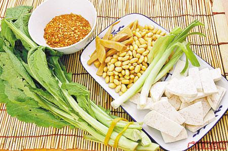 捺菜:芥菜莖1斤、竹笋半條、黃豆半碗、大蒜、芋頭3隻(切片)、辣椒粉3-4湯匙、鹽2-3湯匙