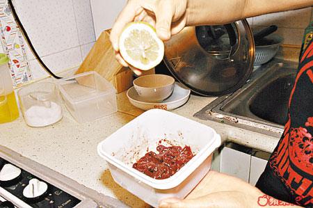 當加入辣椒粉醃製捺菜時,除了用手搓,之後還要用力揸,這樣辣椒粉才會滲透入其他材料內。