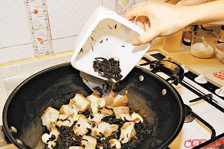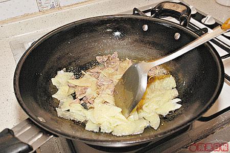 2.燒滾水,把五花腩放進煲內煮,直至肥油盡出,撈起瀝水切件,放進已燒滾的油內炒香。