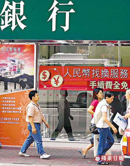 【本報訊】消息透露,人民幣業務可望擴闊經營範圍,主要是第一階段業務經檢討後,獲准進一步放寬,包括納入企業及商戶成為人民幣存款的客戶對象,但有關客戶只獲准存入人民幣現鈔,即所謂「抬現鈔」存款,銀行僅提供收鈔服務,不能像個人客戶可每天按限額,將港元兌換人民幣存入帳戶;另外,現時個人客戶每日不可兌換超過2萬元人民幣的上限也將獲得提高。