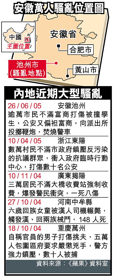 內地又發生嚴重的大規模騷亂事件!安徽省池州市一批見義勇為市民,不滿私家醫院老闆及其手下欺凌在交通意外中被撞受傷的中學生,當街和老闆理論,卻遭老闆報復,公安到場將老闆帶走保護,逾萬名市民不滿,包圍派出所,官民對峙兩小時後,終觸發嚴重騷亂,上萬名市民忍無可忍,焚燒警車,向派出所拋擲鞭炮,至少六名武警受傷,幾名市民被捕。