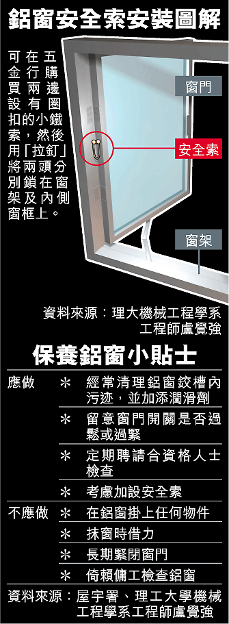 近日發生多宗鋁窗飛墮事件後,盧覺強建議為鋁窗加添安全索(見圖)。方法是到五金舖購買一些四吋長、兩邊有圈扣的小鐵索,然後用「拉釘」將小鐵索兩頭分別固定在窗架和窗框內側,作為保險措施。他說,每條小鐵索售價只數元,故所費不多。