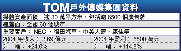另外,TOM傳媒昨宣布,歷時3年半的品牌統一工作經已完成,旗下14間附屬子公司,已正式歸納在「TOM戶外傳媒集團」品牌下。
