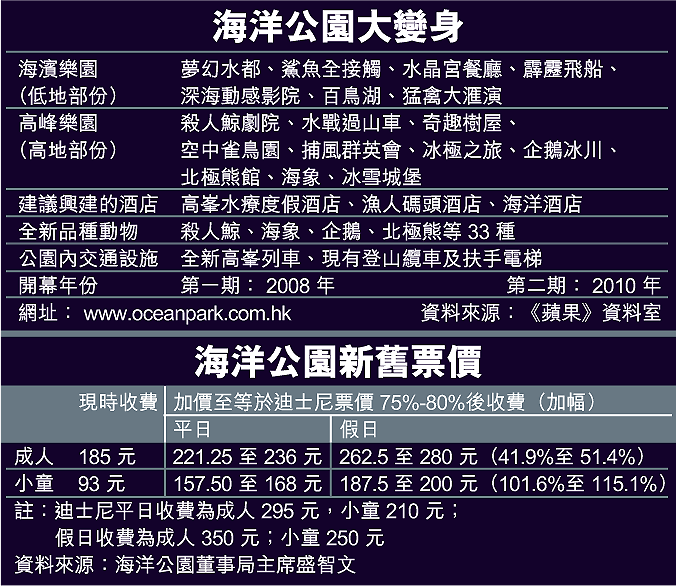 【本報訊】香港迪士尼樂園開幕在即,其競爭對手海洋公園不敢怠慢,計劃斥資五十五億元以大變身。董事局主席盛智文昨表明,擴建後需要增加入場費,最快會在○八年開始考慮加費,新收費是迪士尼樂園票價的七成半至八成,預料加價後的成人門票最高二百八十元,增幅近五成二;小童門票最高為二百元,升幅高達百分之一百一十五。旅遊業界指出,加費未必影響人流,最重要是物有所值。 記者:許偉賢、譚暉